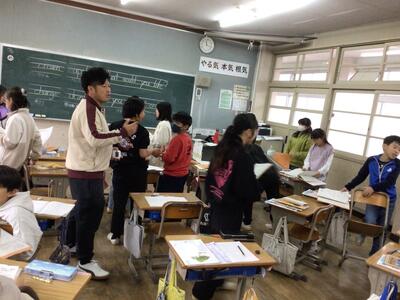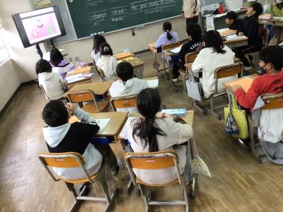 今日の外国語では、日本各地の料理を楽しむために、食事の注文や値段を聞き取ること等を学習しました。軽快な音楽に合わせて会話の様子が再現される映像を見ながら、表現の仕方を確認します。楽しい雰囲気で学習は進み、その後は、ペアや3人で会話のやり取りを練習します。繰り返し行うことで、力を付けていきます。