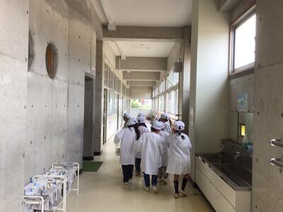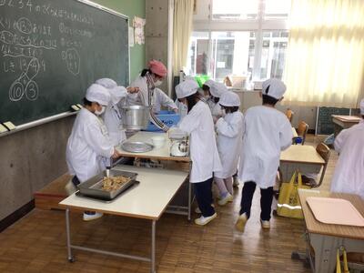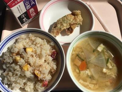 今日の献立は、さつま芋ご飯 鶏肉の磯辺揚げ 大根のみそ汁 牛乳でした。午前中から、大根のいい香りがしていました。展示食を見た子どもたちも、「美味しそうだな。」「さつま芋は、こういう感じにご飯に入っているのか。」と嬉しそうでした。給食委員さんは、「竹輪も美味しいけれど、鶏肉の磯部揚げも美味しいですよ。」と伝えていました。外側はカリっと、中はしっとりと美味しい鶏肉でした。秋のごちそう、さつま芋ご飯は、彩もきれいで、美味しくいただいていました。