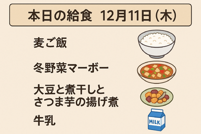 12/11 本日の給食 投稿: 学校管理者 (12/11) 美味しい冬野菜が入ったマーボー豆腐。かぶやかぶの葉も入っています。かぶはやわらかく、葉はシャキッとした食感で美味しかったです。大豆と煮干しとさつまいもの揚げにはカルシウムが豊富で、食べやすく人気の献立です。 Tweet -