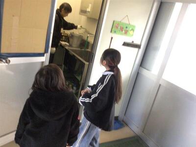 冬も掃除を頑張る子どもたちに、妓労員さんが、お湯を用意してくださいます。