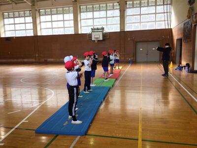 1/15 マットを使った運動遊び【2年生】 投稿: 学校管理者 (13:07) 準備運動が元気よくできた2年生。マット運動で使う大事な首なども、ていねいに動かします。 ゆりかごや、かえるの足打ちなど、運動遊びを楽しく行いながら、 基本的な動きができるようにしたり、工夫したりして楽しく遊びます。 大事な頭を守れるように、スタートの位置に気を付けて。 Tweet -