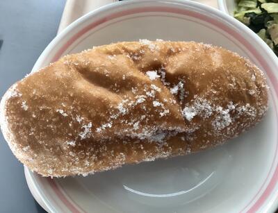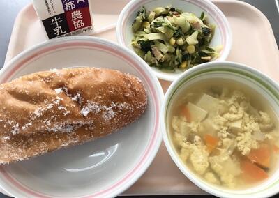 本日の献立は、シュガー揚げパン・ほうれん草のソテー・卵スープ・牛乳です。