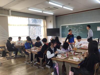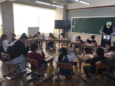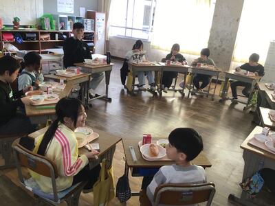 「yummyです。」と元気に答える子どもたち。😄今日はALTの先生と一緒に給食をいただく日でした。