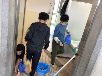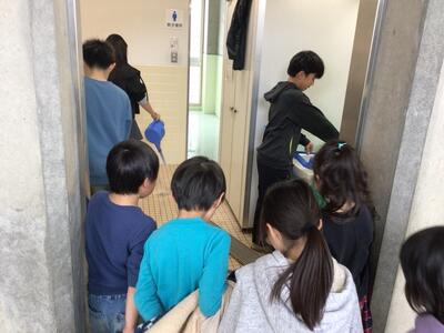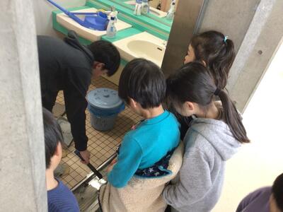 1年生が、トイレ掃除をしている6年生の様子を見ています。