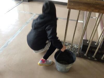 こちらは、バケツの水をすてきに来た3年生。途中で床に水がこぼれていることに気付きました。