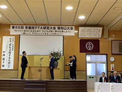 本日、第66回京都府PTA研究大会が福知山で開催されました。開会式に続いて功績のあった個人や団体への表彰が行われました。その中で、高野小学校PTAのこれまでの活動が団体表彰され、PTA会長様が代表として賞状を受け取られました。とてもおめでたいことでした😆