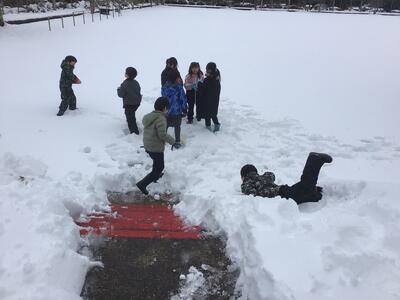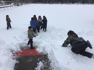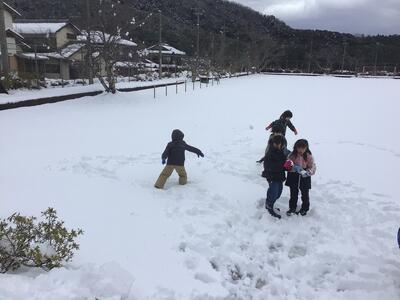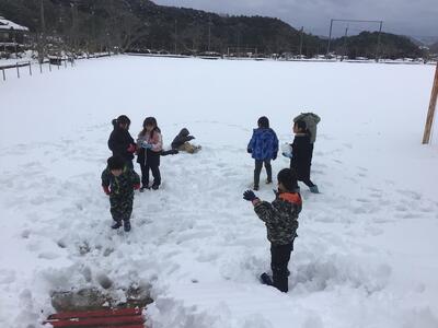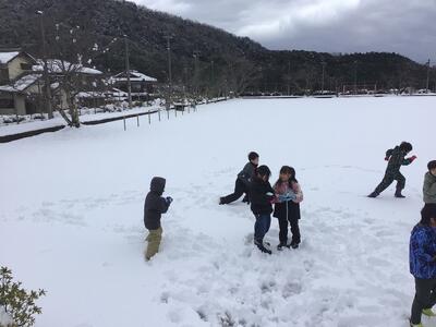 「雪合戦しよう!」誘い合って元気に出かけていきました。