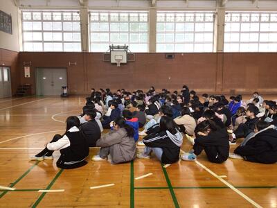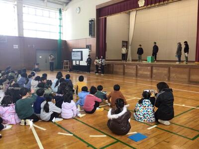 給食集会に集まる子どもたち「😉劇があるんだって、楽しみだな。」