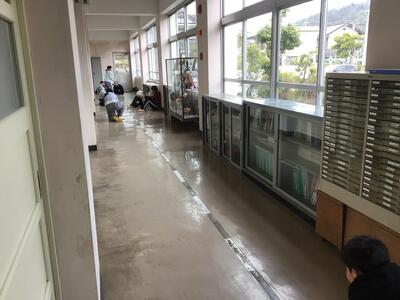 掃除の時間になりました。1階の長い廊下を、今日も5年生が頑張って拭きました。