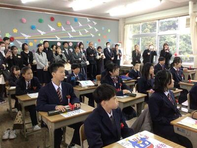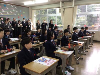 中学校の制服に身を包み、笑顔で卒業生が登校しました。