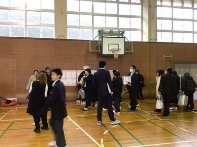 記念写真を撮るために体育館に戻ってきました。体育館に掲示されている、たくさんの方々から、届いたお祝いのメッセージを嬉しい気持ちで読んでいます。卒業生に、温かいお祝いの言葉をいただき、ありがとうございました。