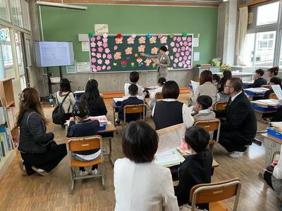 1年生教室にご案内。様子を確かめながら、ゆっくり歩いています。