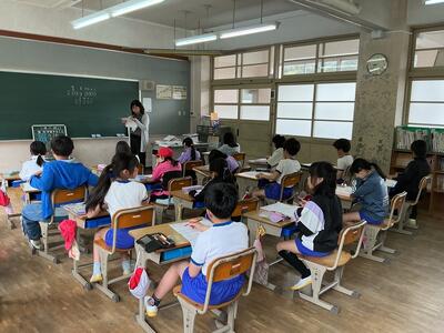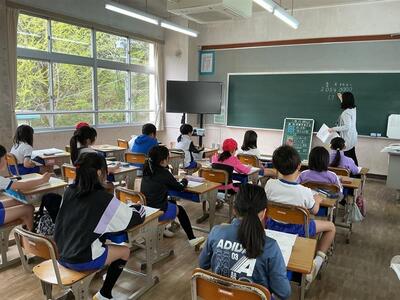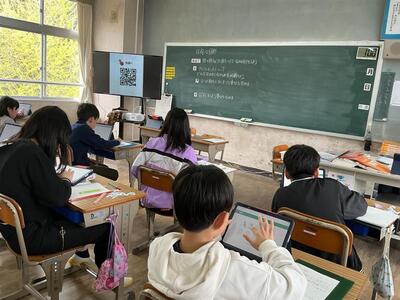 4年生は算数です。宿題でやってきたプリントの内容を確かめています。