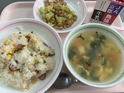 今日の給食は、ウインナーピラフ・のり豆ポテト・卵スープ・牛乳をいただきました。